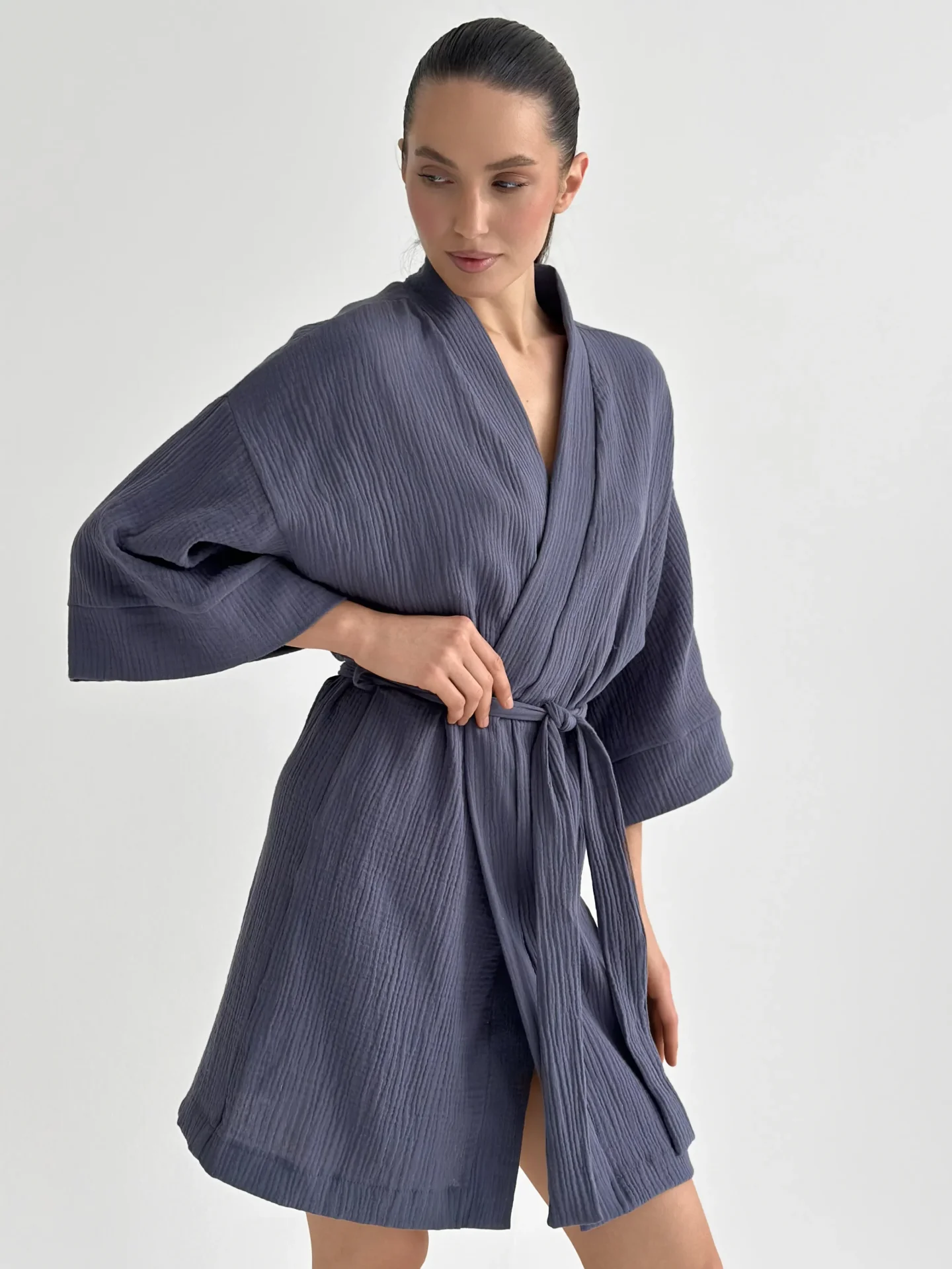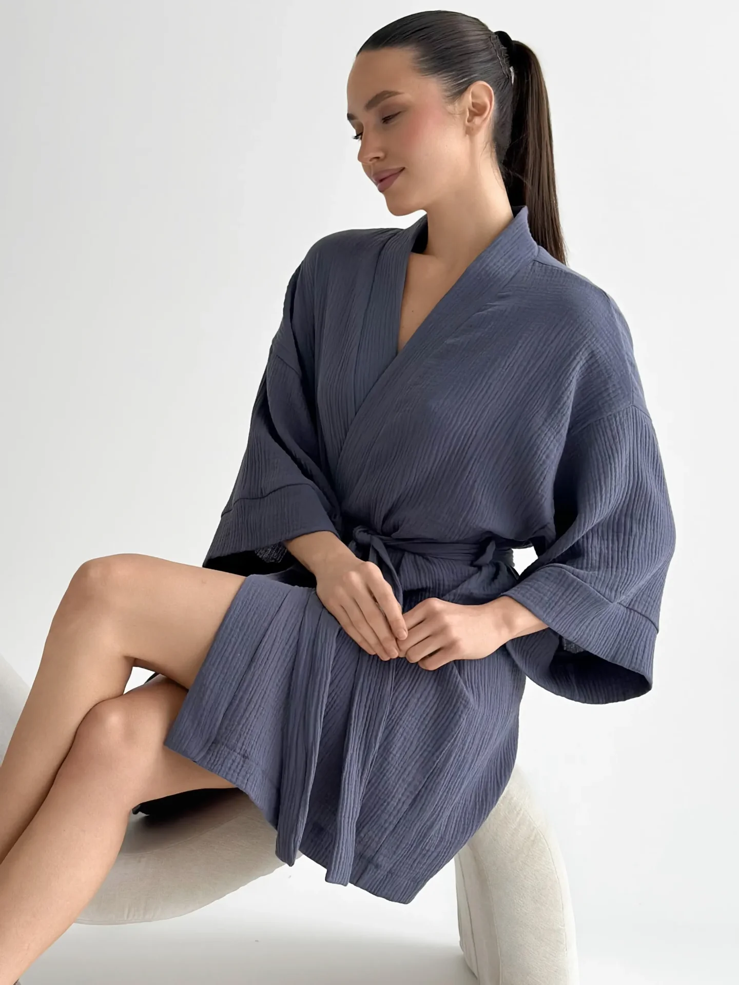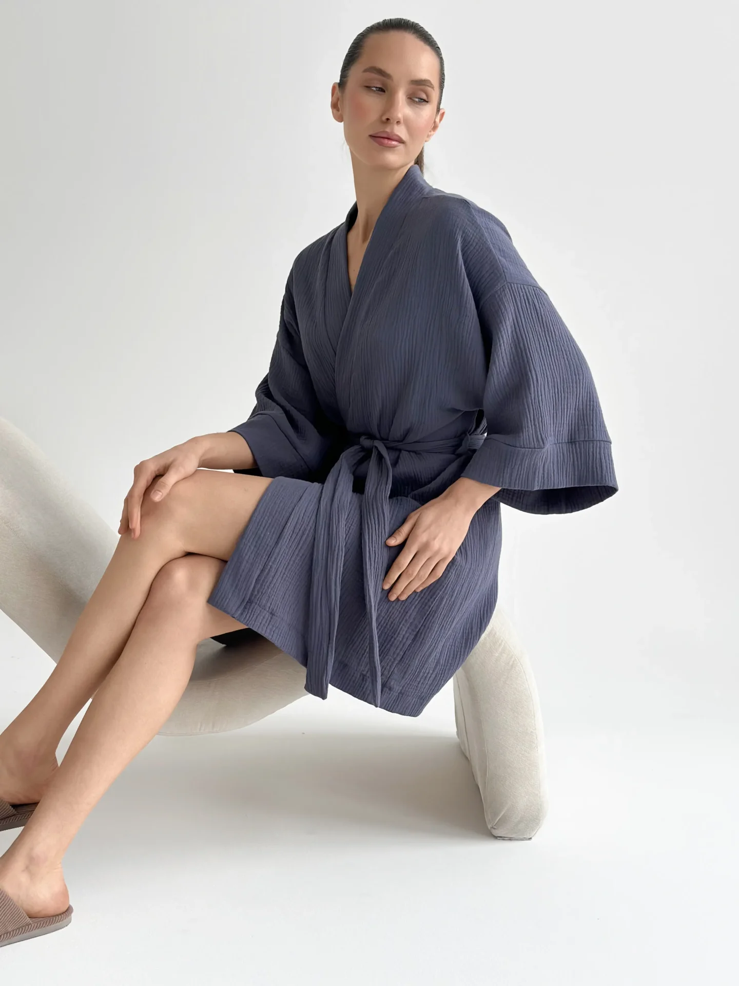 Szlafrok kimono z muślinu stworzony z myślą o lekkości i komforcie noszenia. Naturalny materiał jest przyjemny w dotyku i dobrze przepuszcza powietrze, dzięki czemu idealnie nadaje się do domu i na wypoczynek. Luźny krój zapewnia swobodę ruchów i swobodny styl.