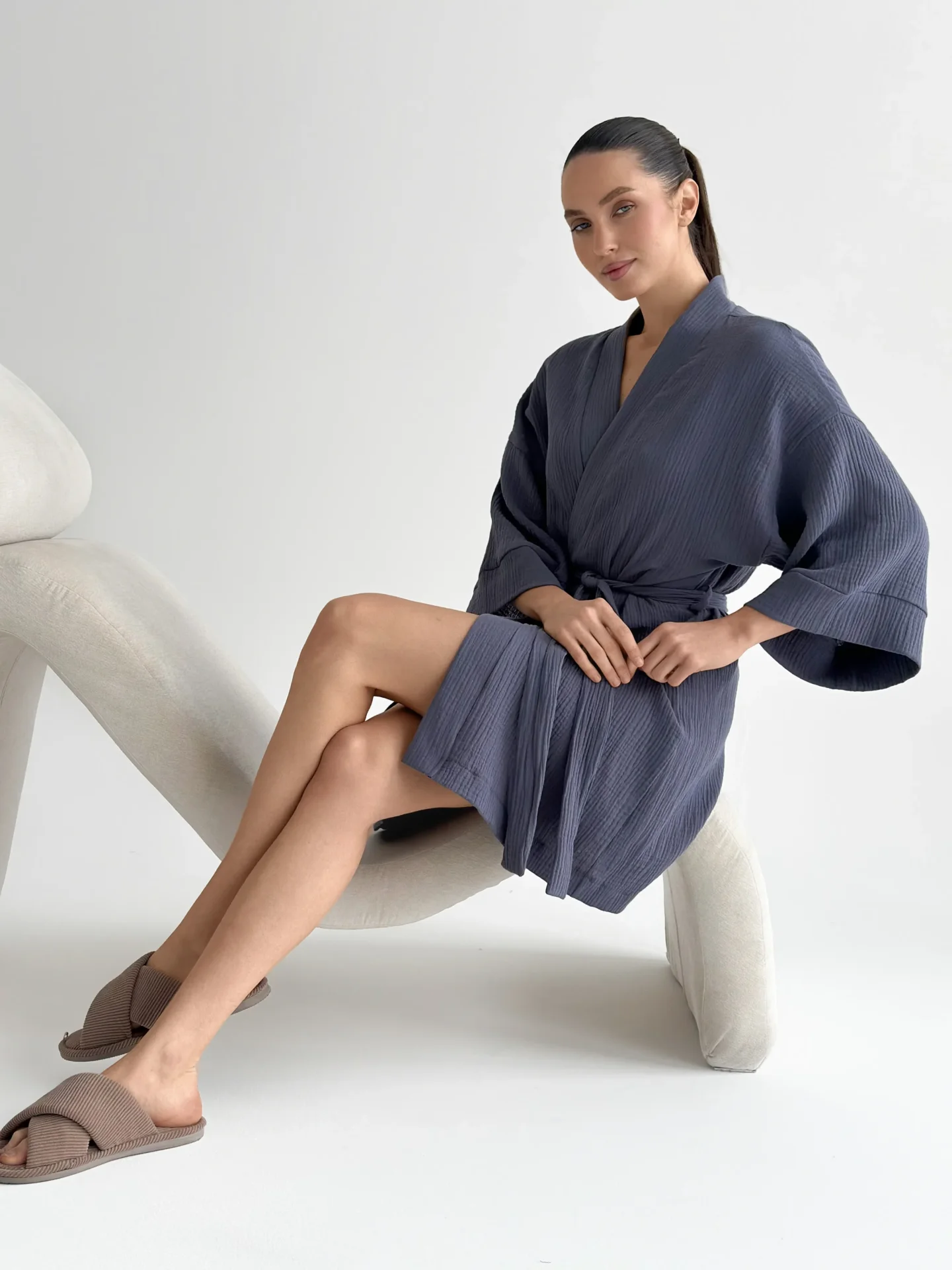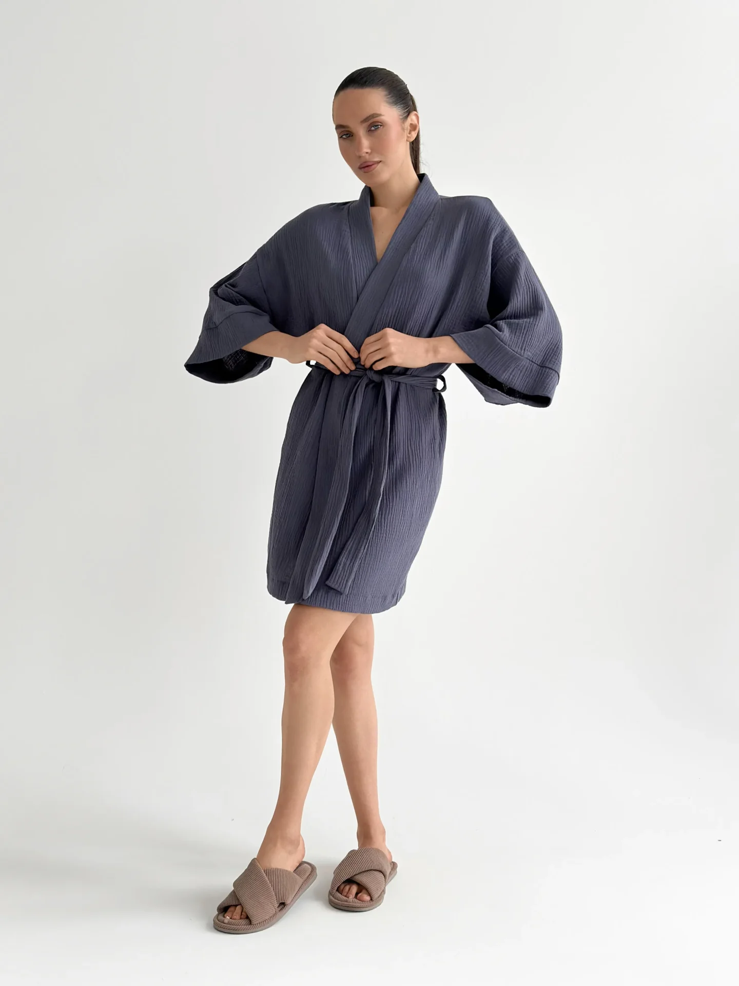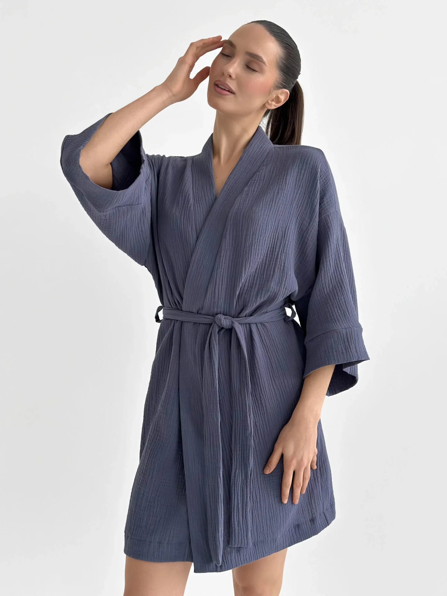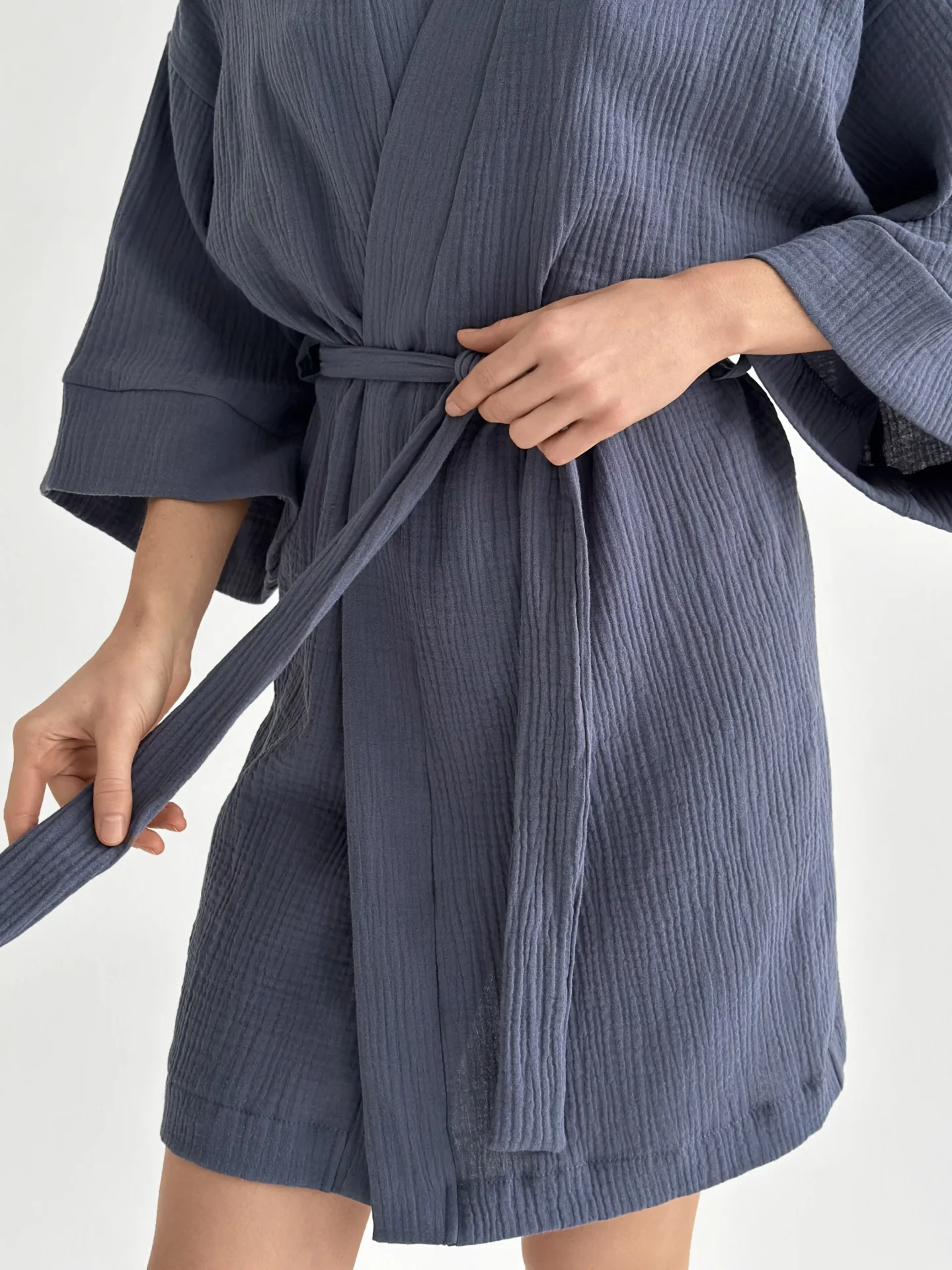 Szlafrok kimono z muślinu stworzony z myślą o lekkości i komforcie noszenia. Naturalny materiał jest przyjemny w dotyku i dobrze przepuszcza powietrze, dzięki czemu idealnie nadaje się do domu i na wypoczynek. Luźny krój zapewnia swobodę ruchów i swobodny styl.