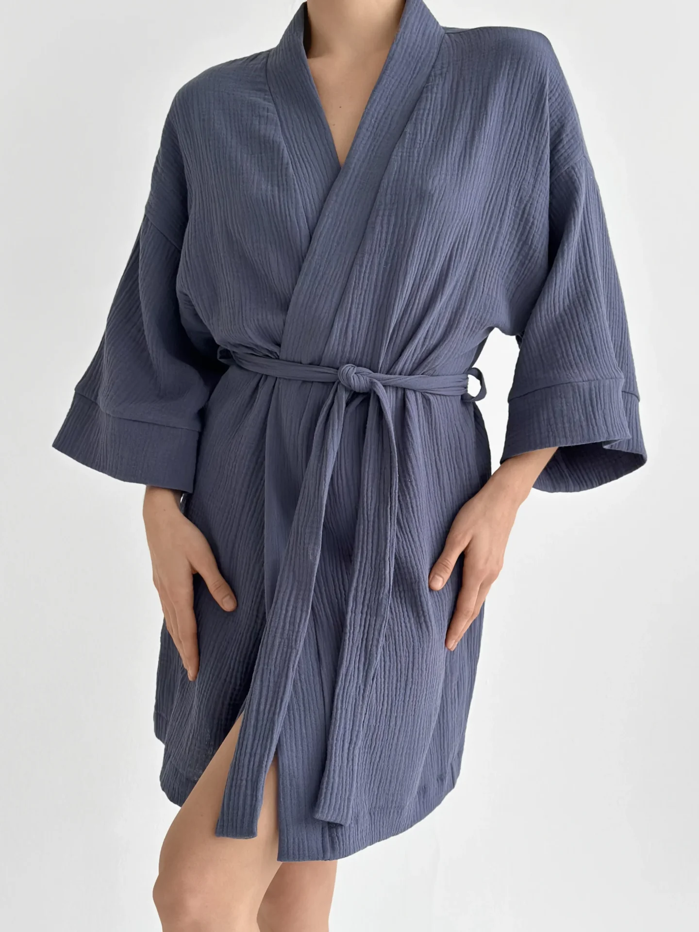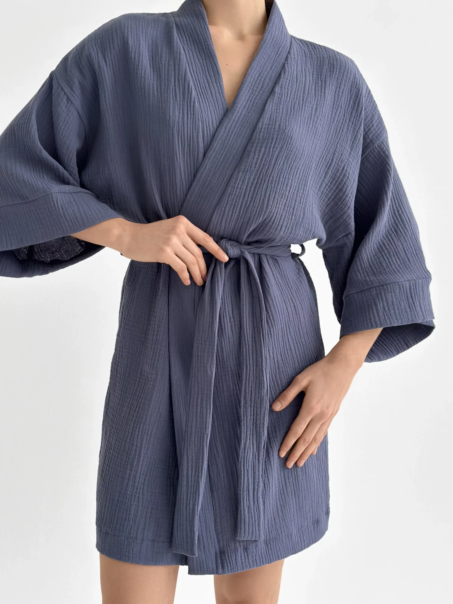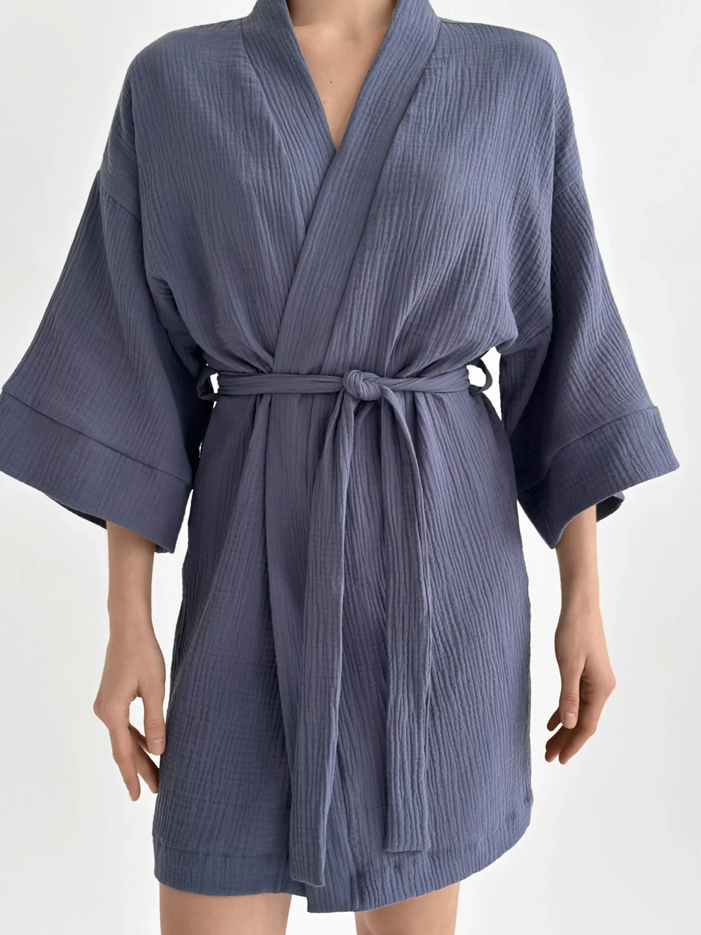 Szlafrok krótki kimono z muślinu dwuwarstwowego, jasnoniebieski