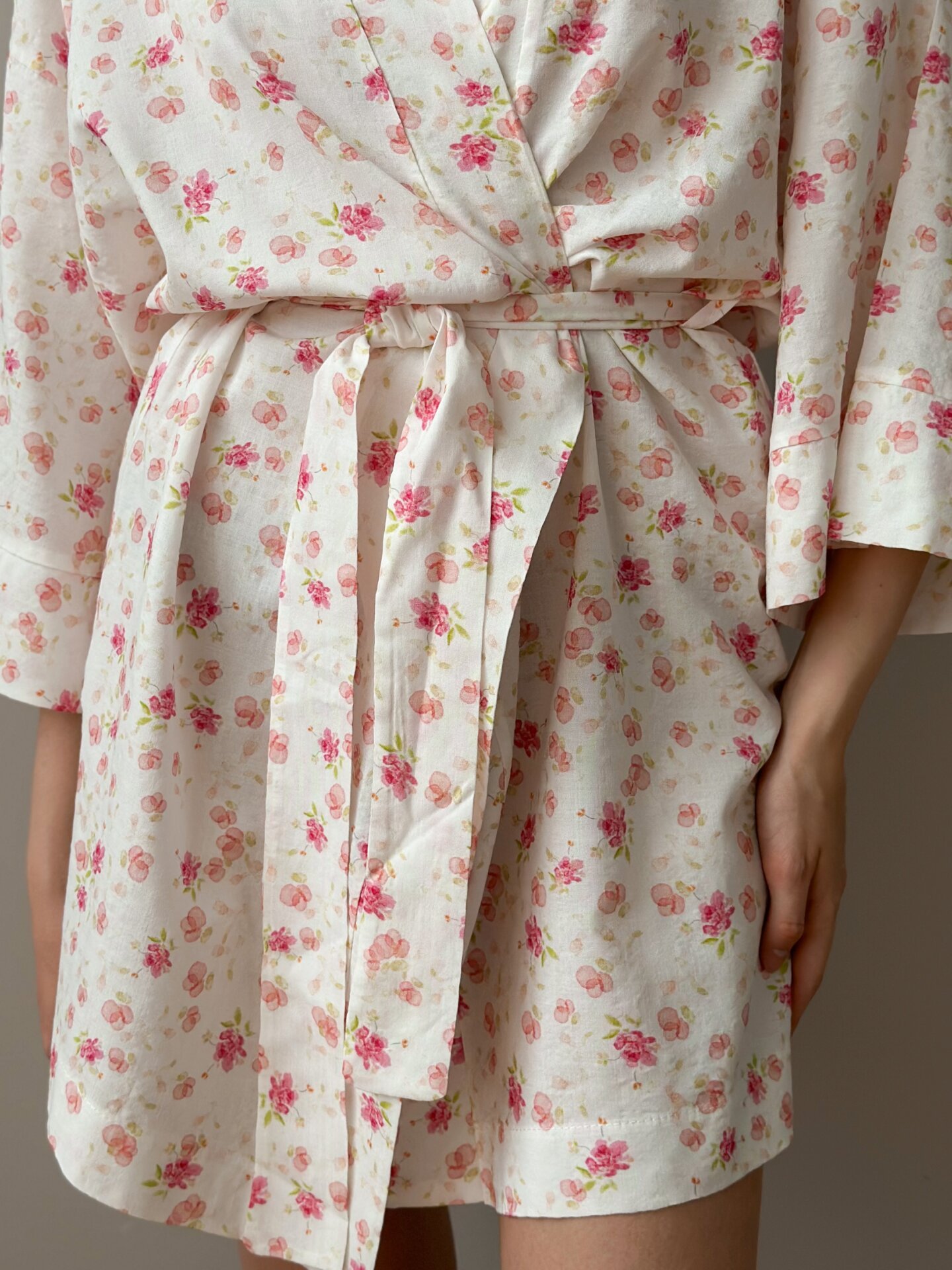 Szlafrok krótki z batystu, biały w akwarelowe wzory