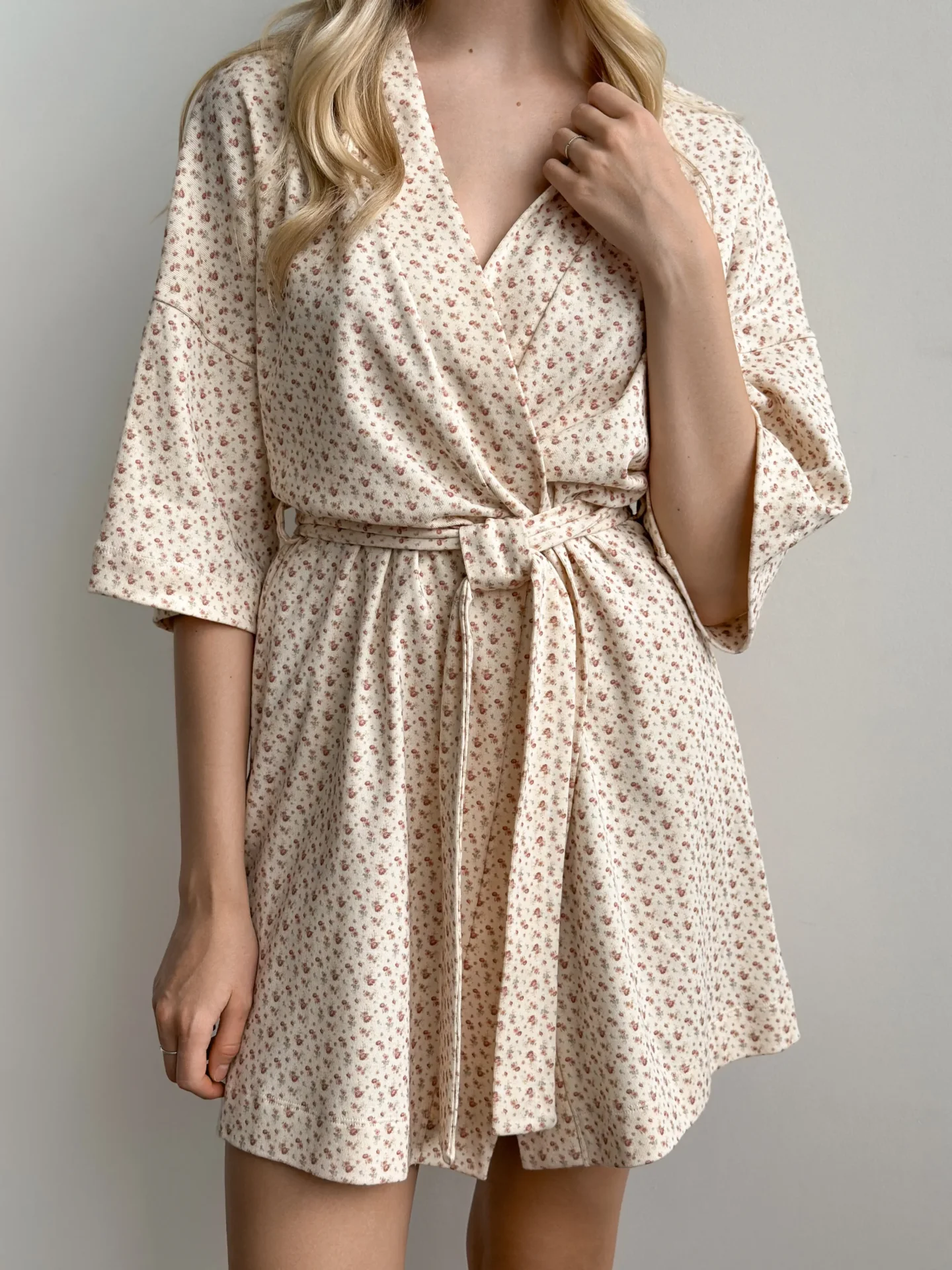 Szlafrok krótki z ribany, kremowy w terakotowe róże