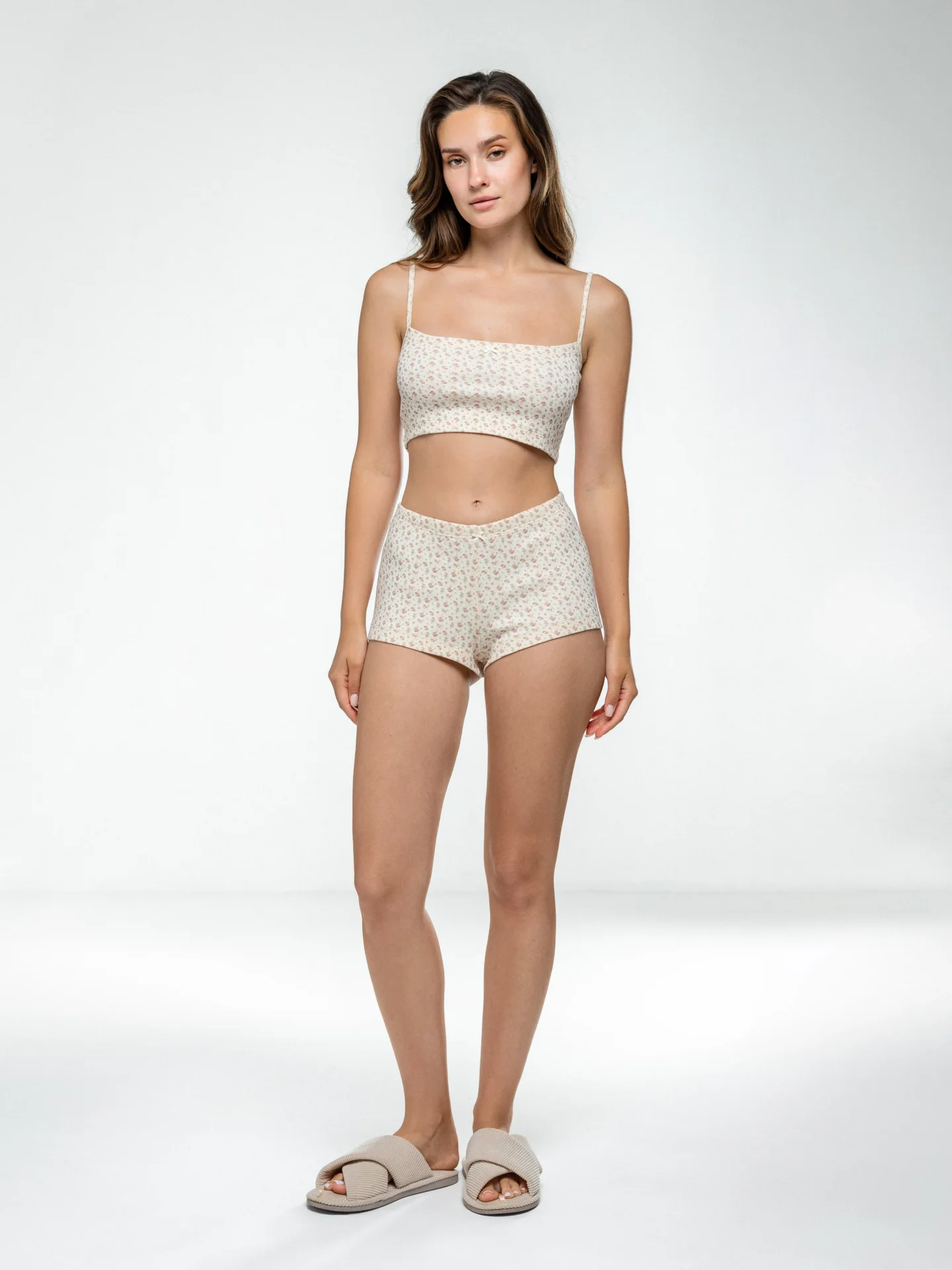 Szorty mini z ribany, kremowe w terakotowe róże