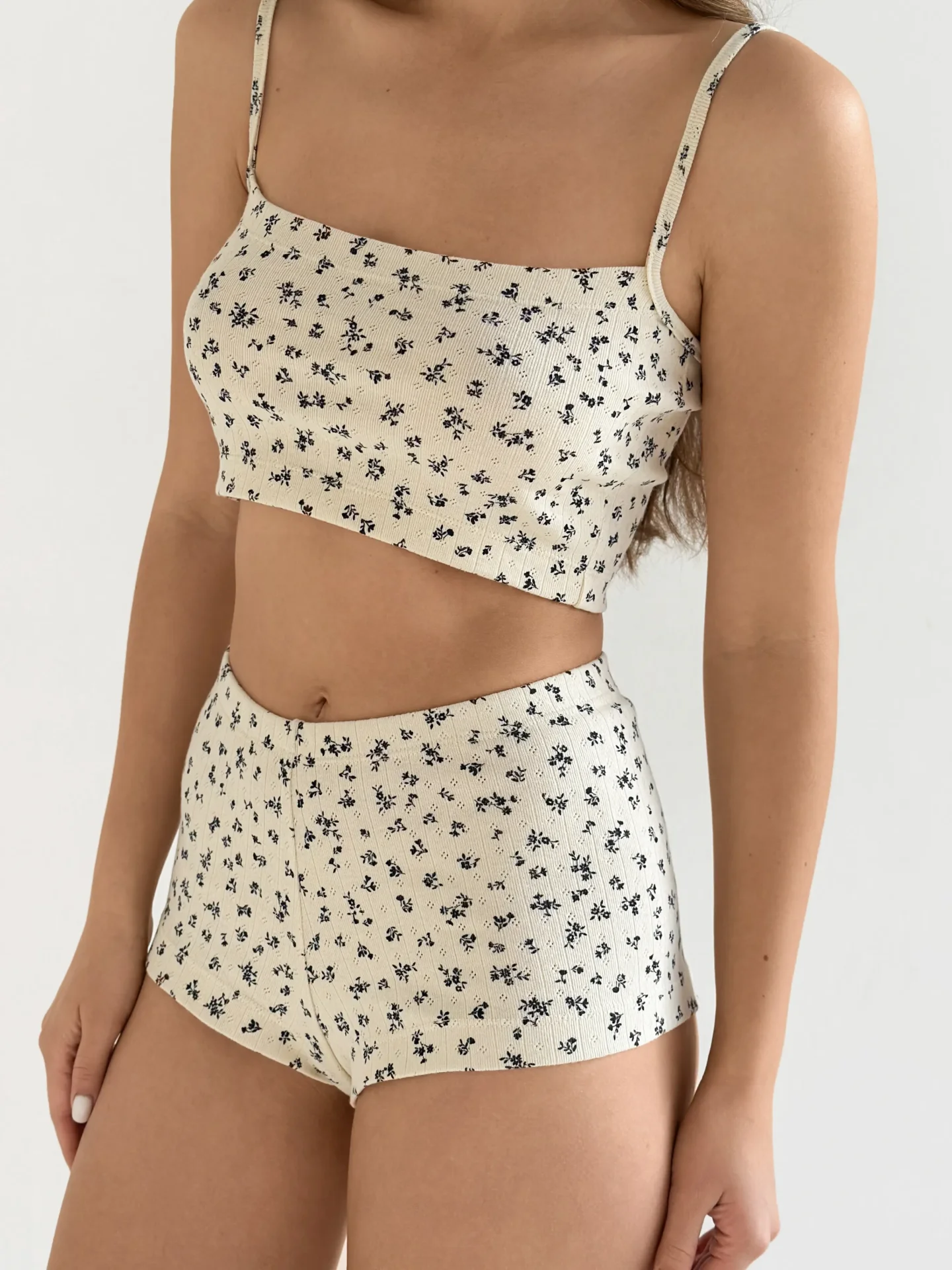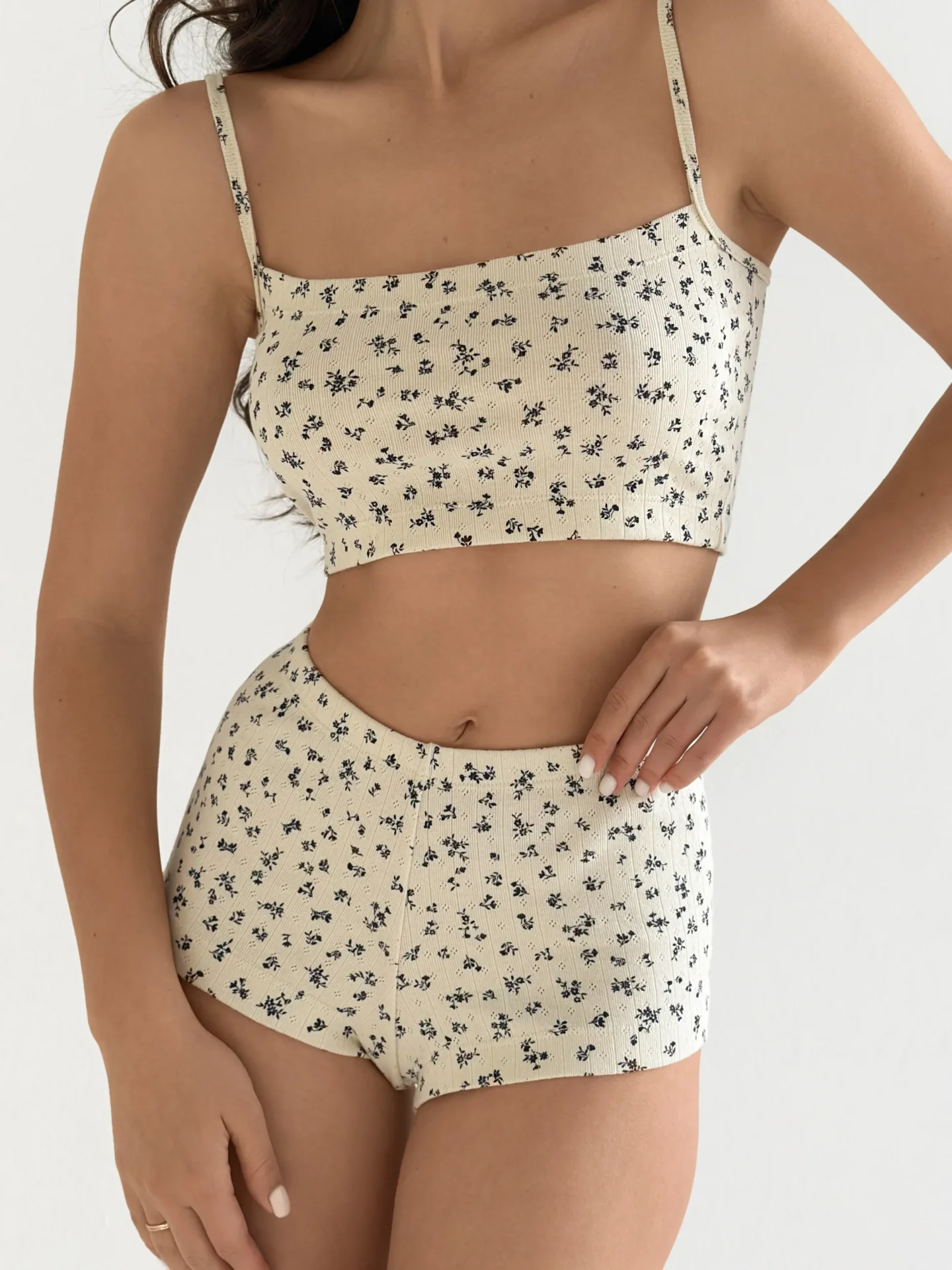 Szorty mini z ribany prążkowanej, kremowe w granatowe kwiatki