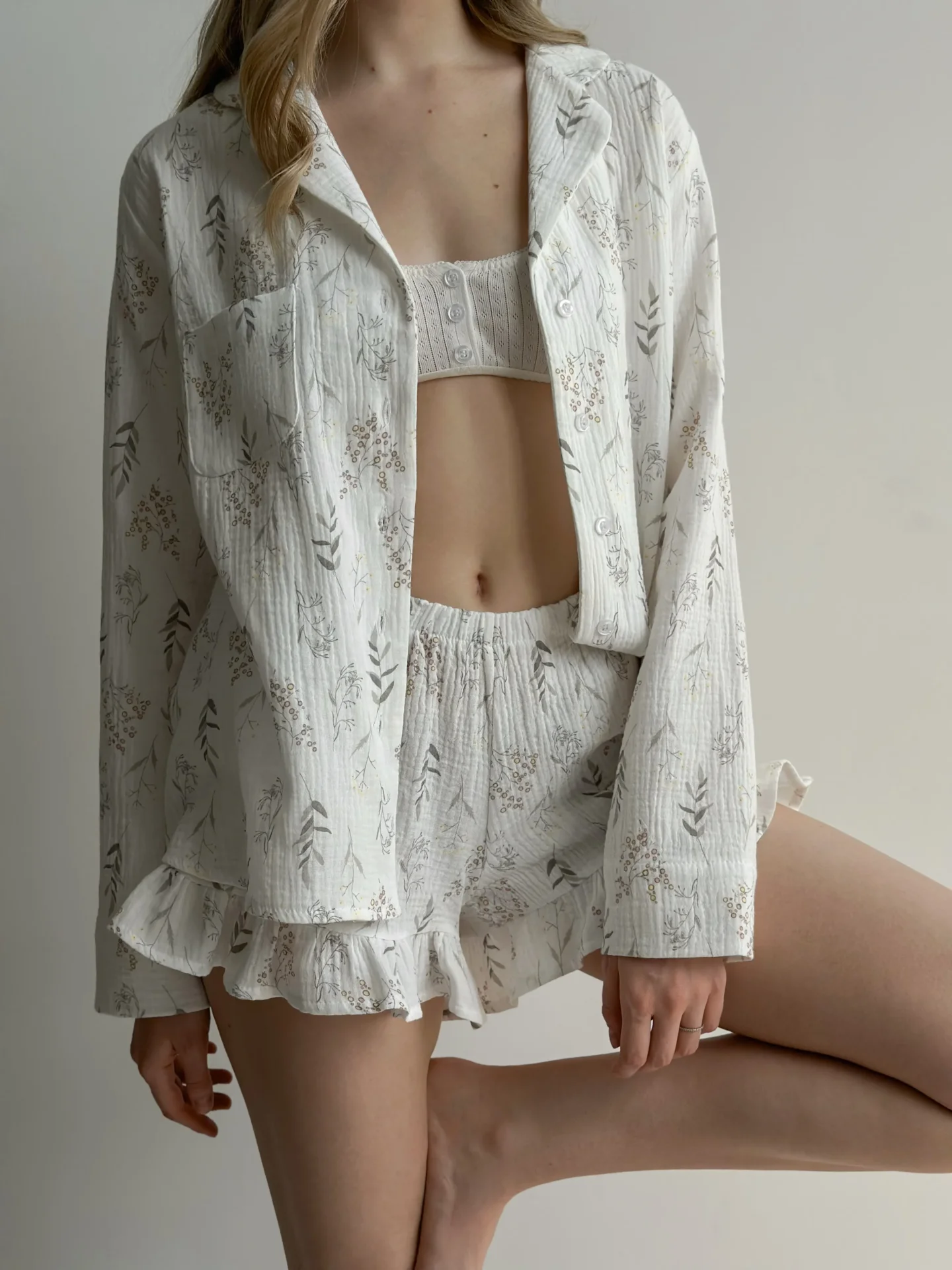Szorty Mono z falbanami, z muślinu, białe w polne kwiaty