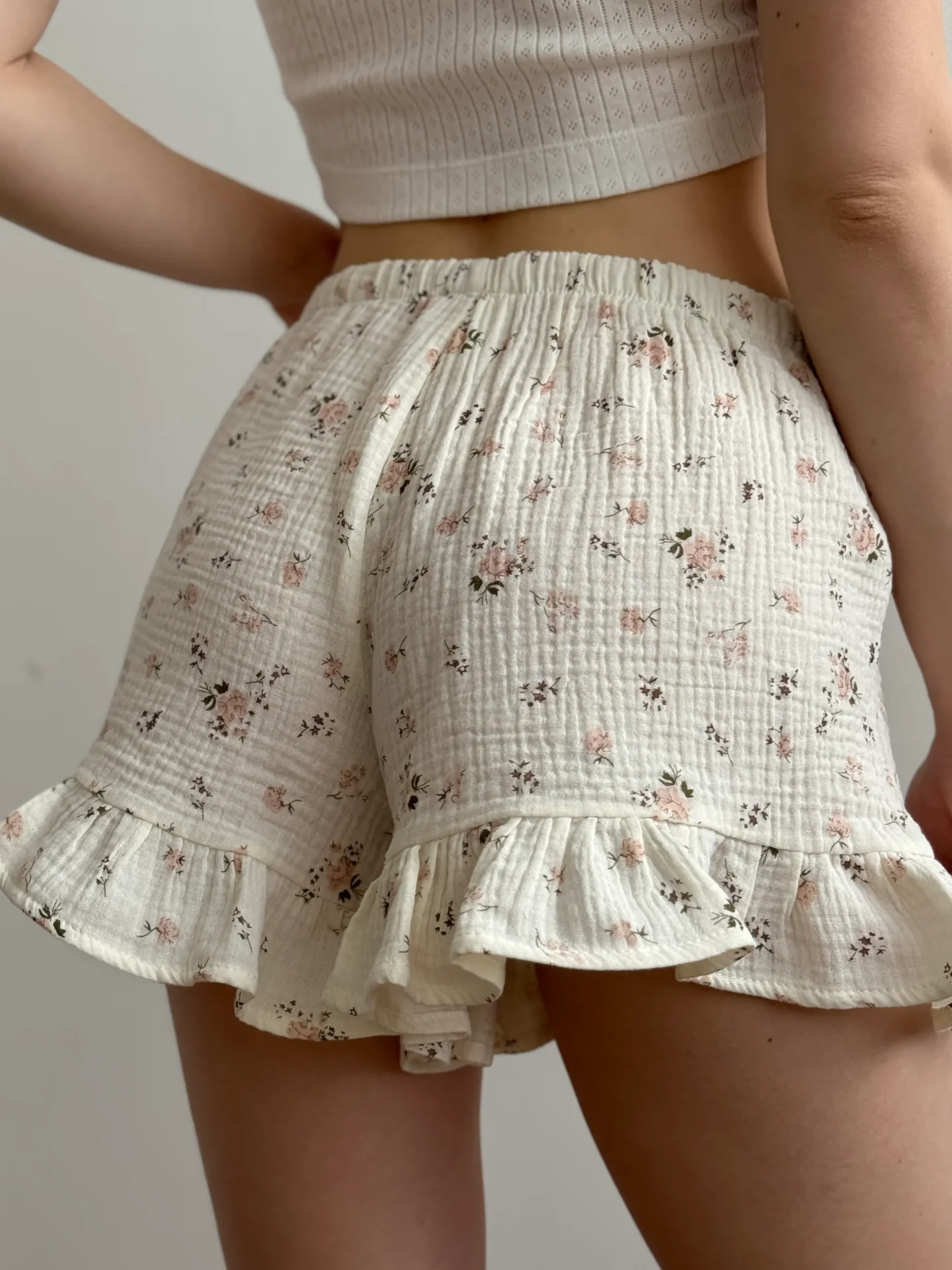 Szorty z falbanami, z muślinu, kremowe w brązowe róże