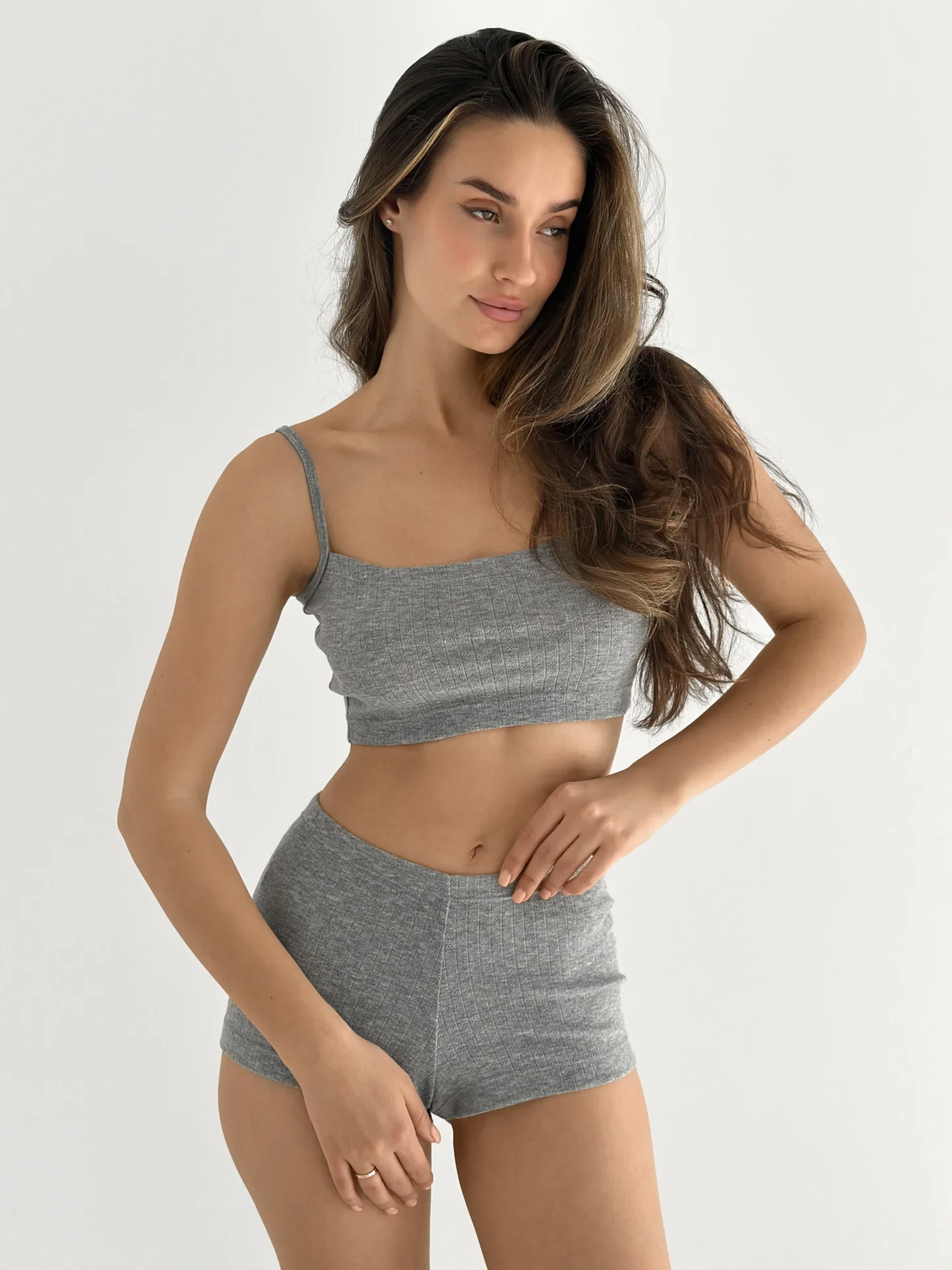 Top Ribana to stylowy i wygodny element garderoby. Wykonany z elastycznego materiału z delikatnym pionowym wzorem, zapewnia wygodę i dodaje elegancji. Idealnie nadaje się do codziennej garderoby, pasuje zarówno do domowych zestawów, jak i do codziennych stylizacji.