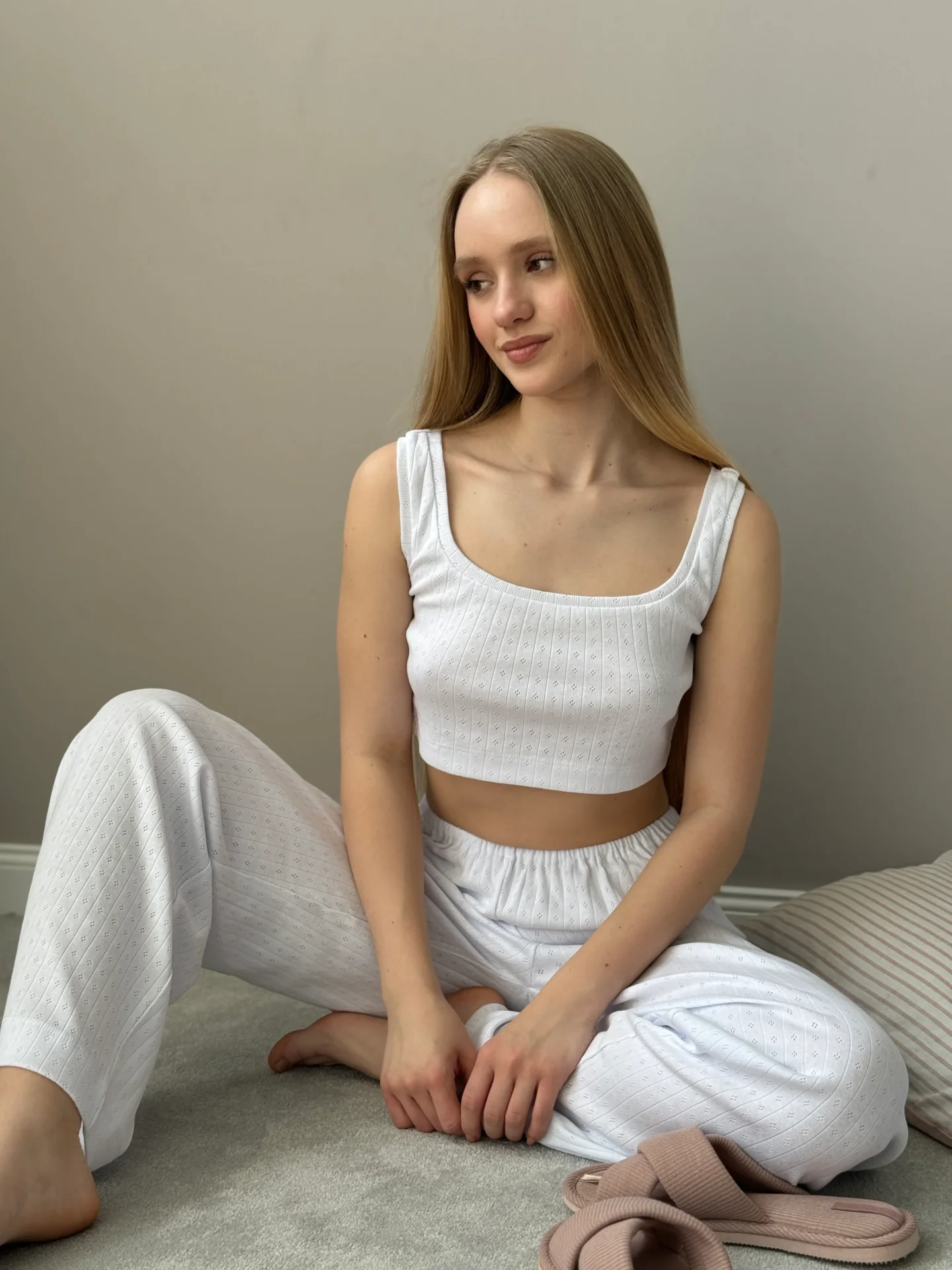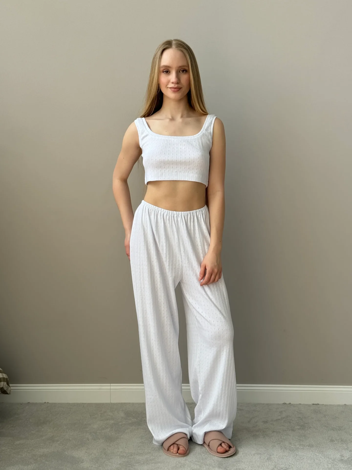 Top Ribana to stylowy i wygodny element garderoby. Wykonany z elastycznego materiału z delikatnym pionowym wzorem, zapewnia wygodę i dodaje elegancji. Idealnie nadaje się do codziennej garderoby, pasuje zarówno do domowych zestawów, jak i do codziennych stylizacji.